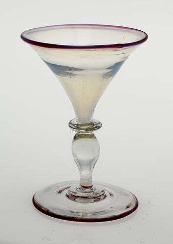 Blown glass. Small glass, flared rim tapering to waisted stem and circular foot. Rim and foot edge trimmed in red glass. No markings.