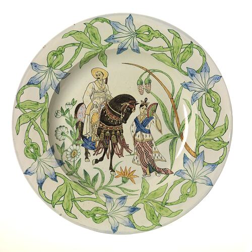 Earthenware charger, cream underglaze. The centre painted with an Eastern woman holding a fan in her left hand, and an Eastern man astride a horse, surrounded by flowering plants. The border has a painted decoration of leaves and flowers in green and blue.