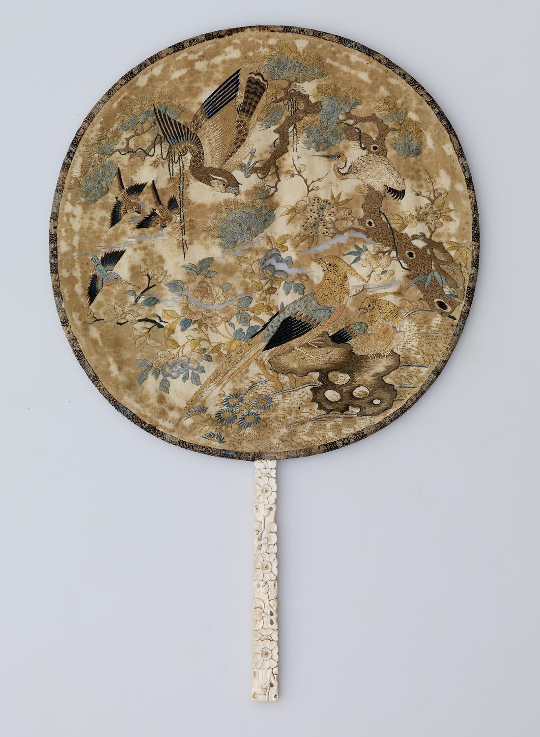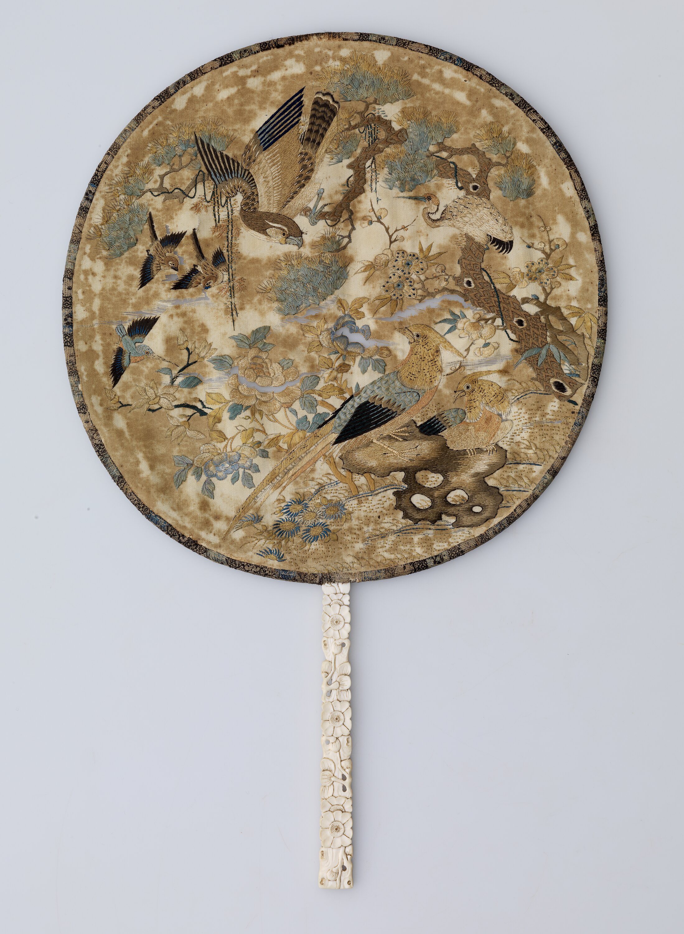 Silk circular fan embroidered with birds and flowers. Ivory handle, carved with flowers and leaves. Very worn and faded. Traces of paper backing around rim on back. No markings.