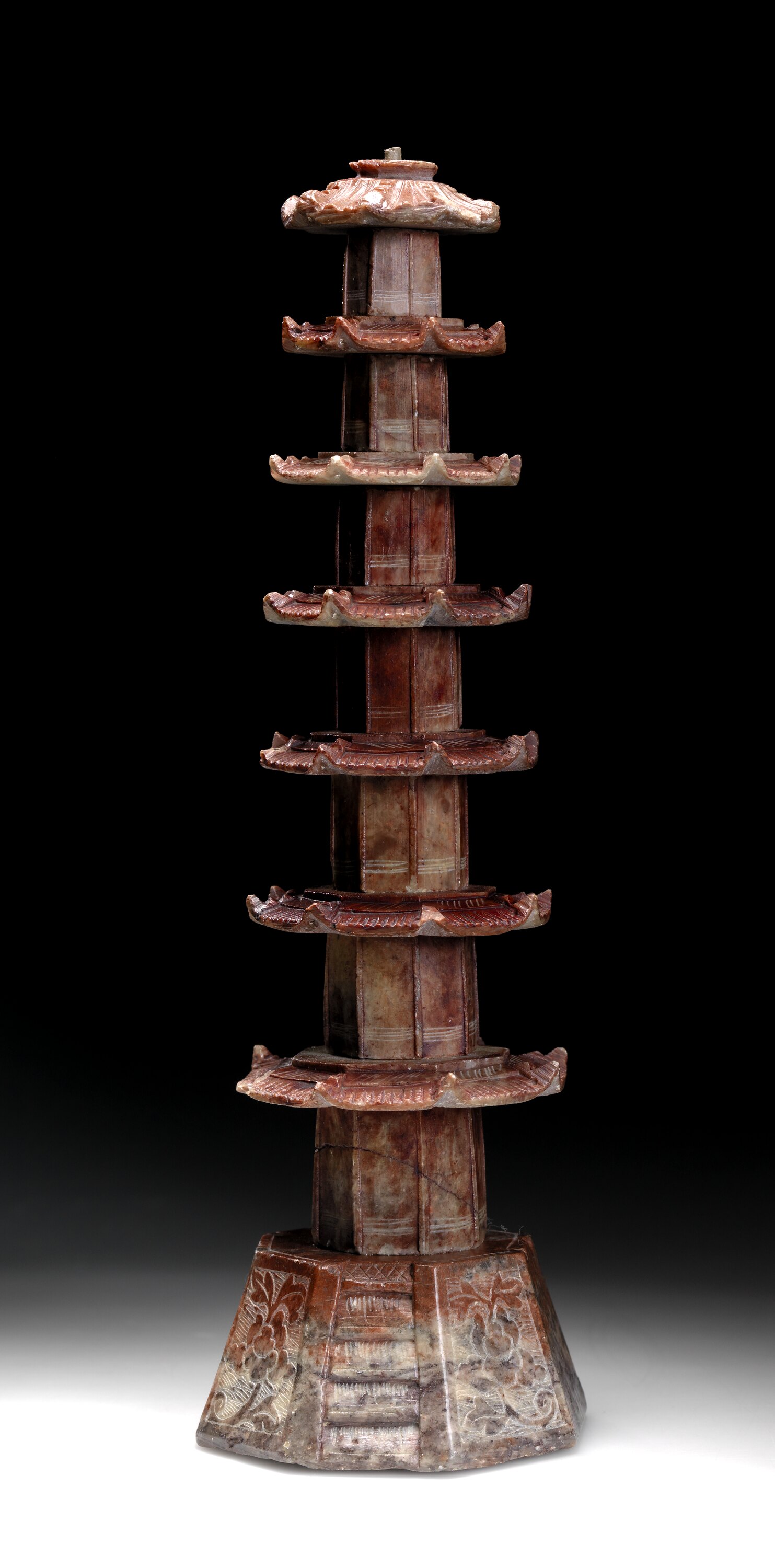 Temple carved in red stone. Tapering octagonal roofs to solid octagonal base. 7 tiers, missing finial. Small holes in each corner of roofs. No markings.