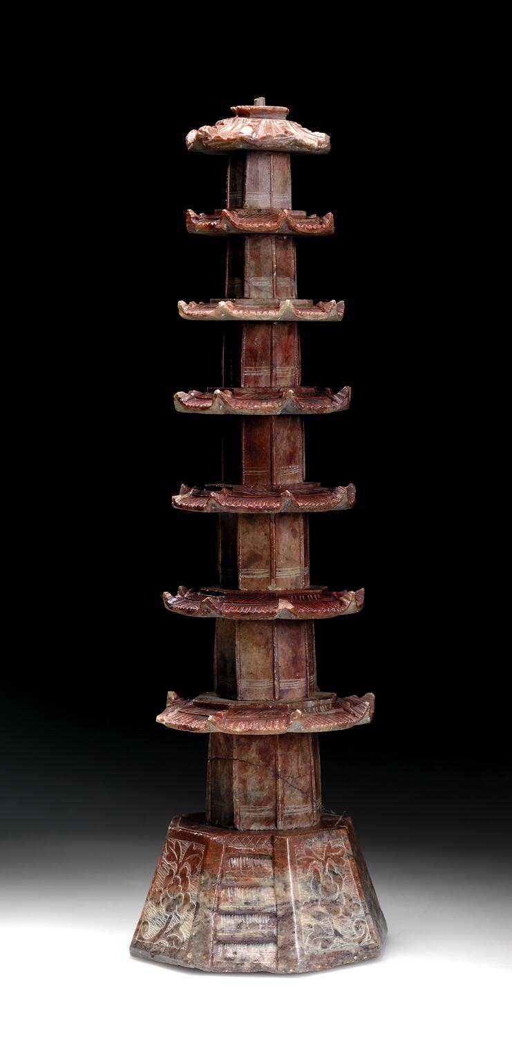 This miniature soap stone temple was probably manufactured by Knight, Bandinel and Co., Newchwang (Niuzhuang, present day Yingkou), China, circa 1880.