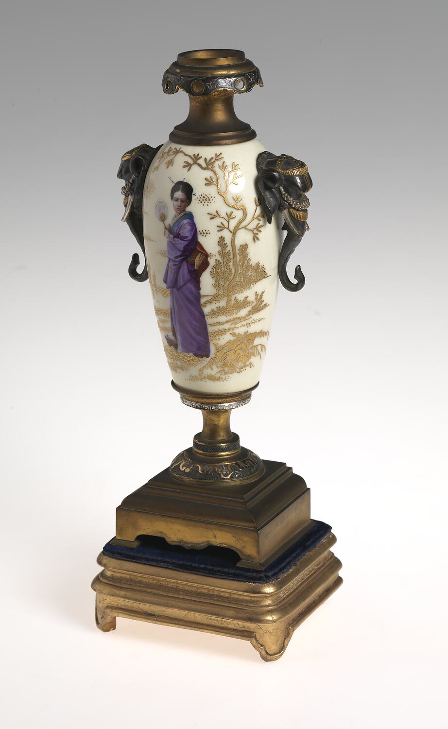 Slightly tapering cylindrical form on raised foot with Grecian decoration on top of a square pedestal, with elephant head handles at shoulder and fluted rim. The bronze body is overlaid with enamel, painted in gold and naturalistic colours. One candlestick features a samurai warrior standing alongside a shore; the other features a courtesan holding a fan, alongside a shore. On the back of each candlestick is an image of a bird in flight amongst gold reeds. Both candlesticks stand on gilded gesso feet, with dark blue velvet tops.