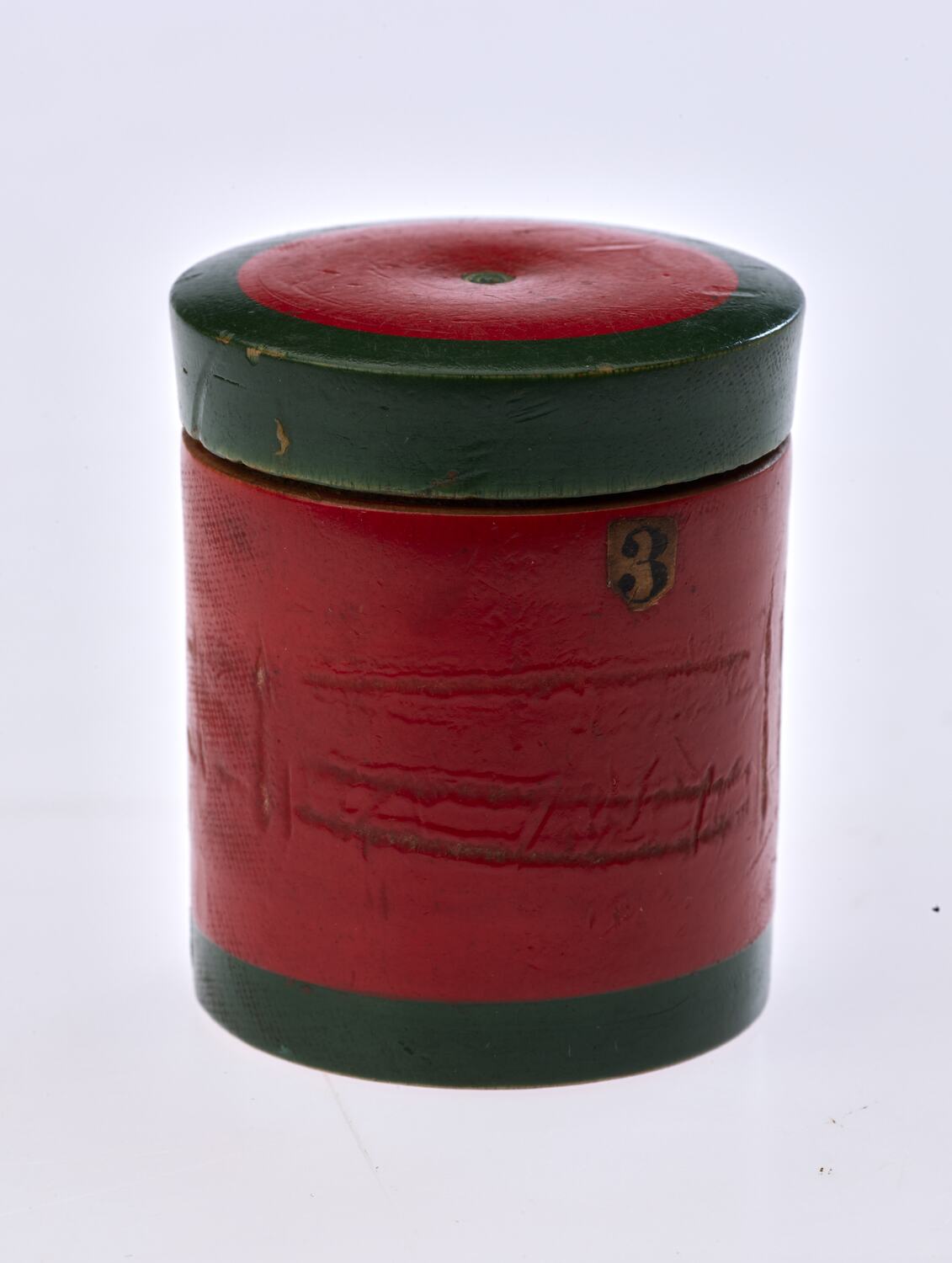 Red and green painted, cylindrical wooden box manufactured in Europe (probably Germany) circa 1880.