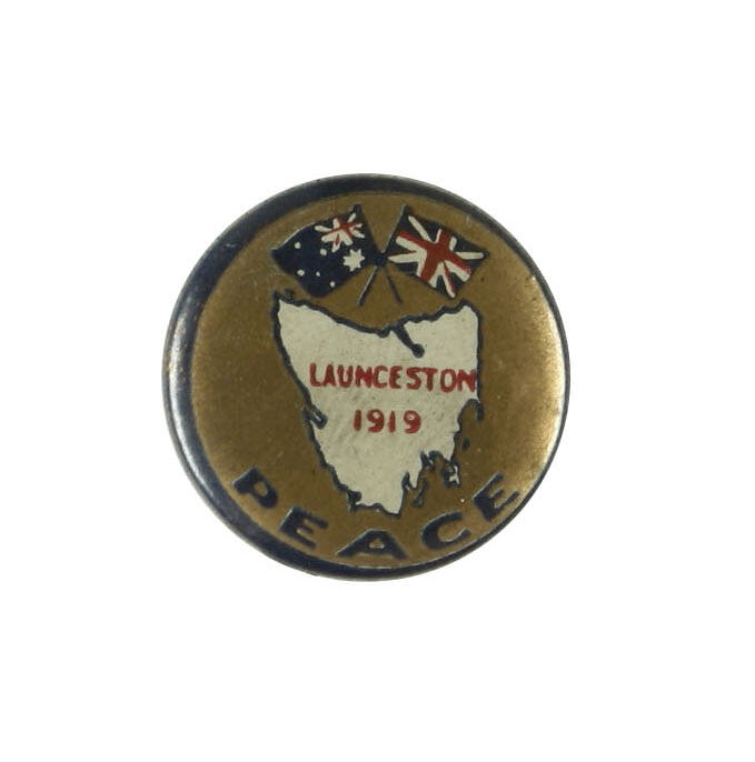 Small metal badge sold during the Launceston Peace Celebrations held in mid-July 1919. The badges were sold throughout the celebrations by children; of the 7000 badges ordered it is unknown how many were sold.