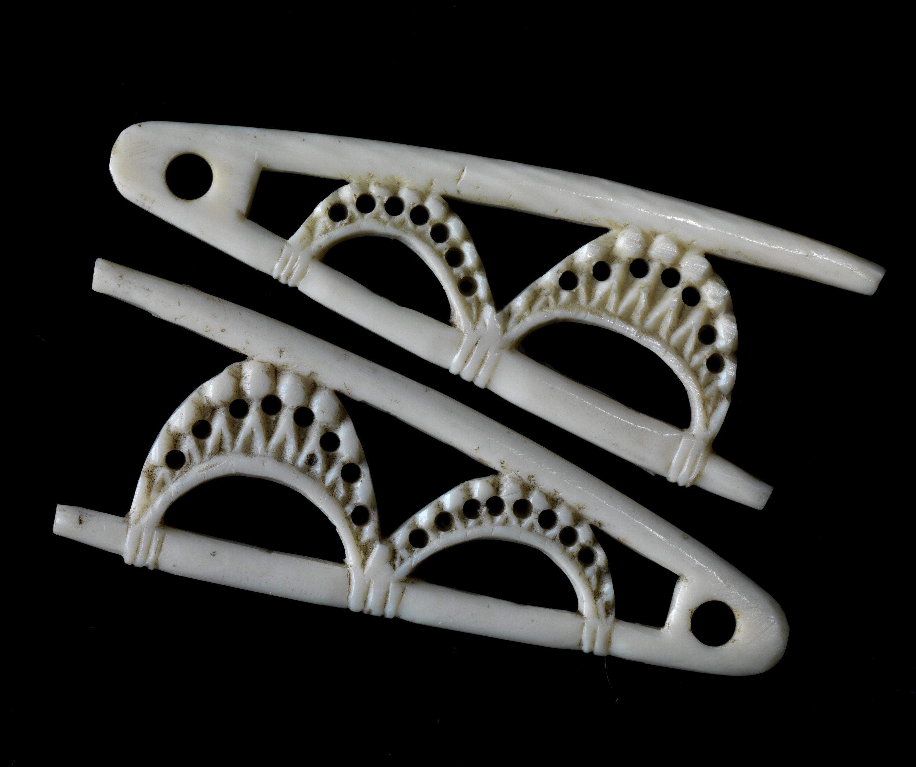 Carved ivory decoration, possibly part of jewellery or a hair clasp. Consists of two broken sections, each forming a flat v-shape. Within the v-shaped borders are two articulated crescents resembling tiaras. The tip of each of the v-shapes has a hole punched through the end.