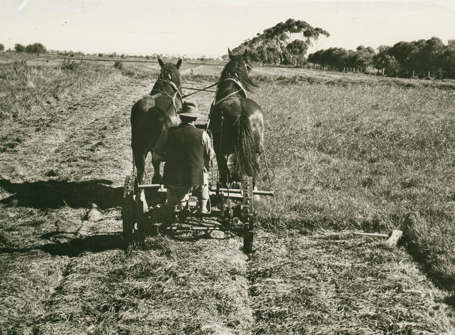 Handwritten in pencil on back, 'HORSE DRAWN MOWER / RECIPROCATING CUTTER BAR / DRIVEN BY MOWER WHEELS' in blue stamp pad ink, 'H.V.McKAY MASSEY HARRIS PTY LTD / Sunshine, Victoria, Australia, / Photo reg. No 112'