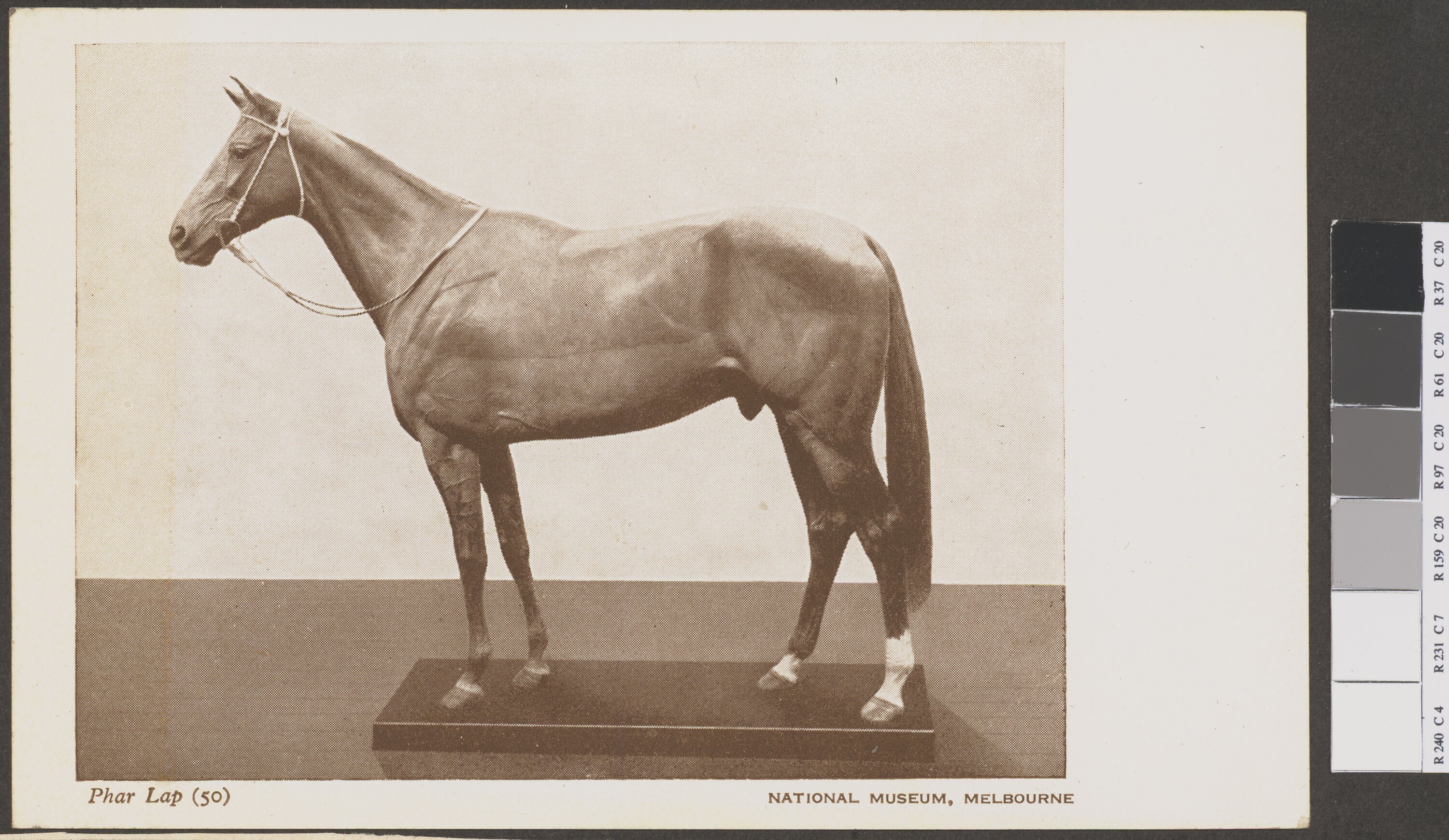 Rectangular postcard with a photographic image of the mount of Phar Lap, with `Phar Lap (50)' and `National Museum, Melbourne' printed on the front.