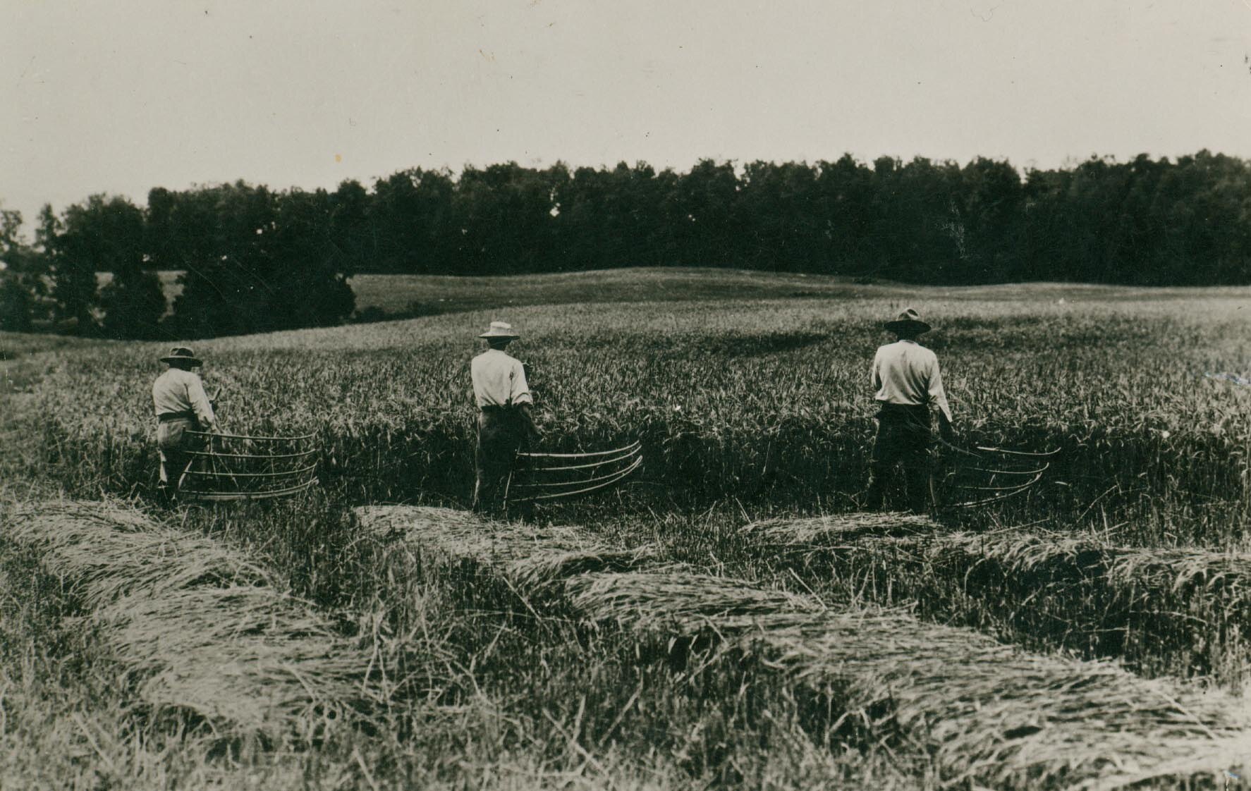 Photograph of men manually harvesting cereal crops by reaping the ripened grain heads and stalks using long-handled sythes with cradles.