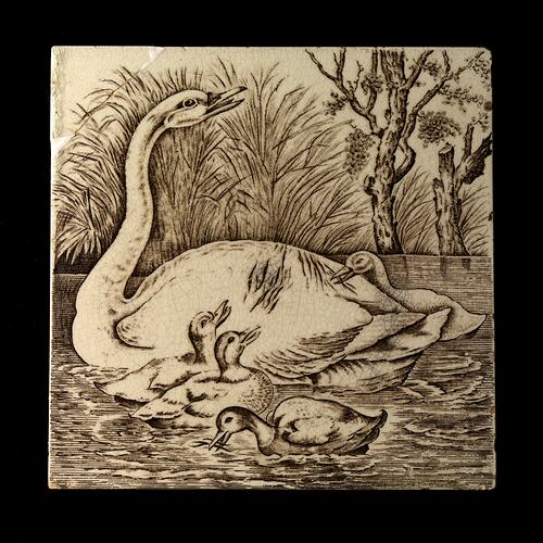 Tile with painted decoration of a swan and cygnets, manufactured in England, post-1891.