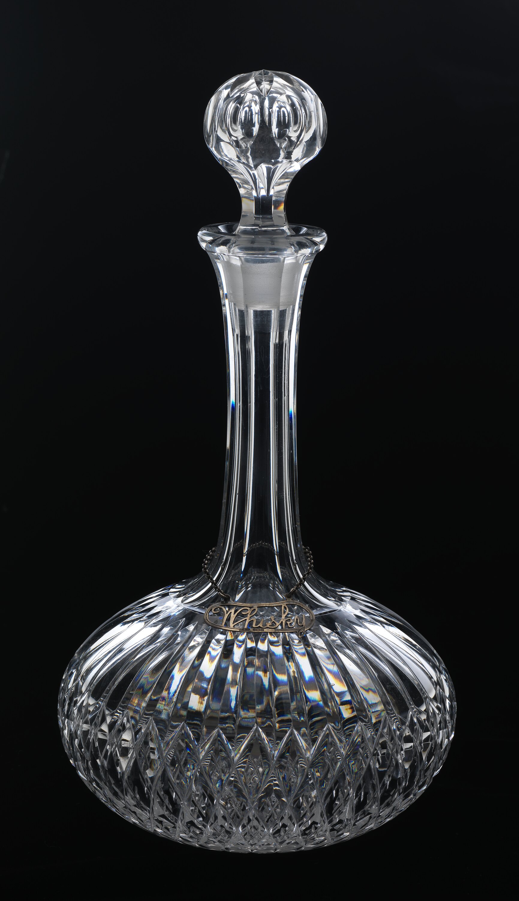 Cut glass, long cylindrical neck with flattened bulbous body. Round stopper. Around neck hangs a silver tag 'Whisky' in simple frame. Whisky collar stamped with Birmingham hallmark of an anchor (town mark) and silver quality mark (lion passant), preceded by L&S probably denoting manufacture by Levi & Salaman, Birmingham. Year mark appears to be either an 'm' - 1886 - or 'w' - 1896, the latter more likely.
