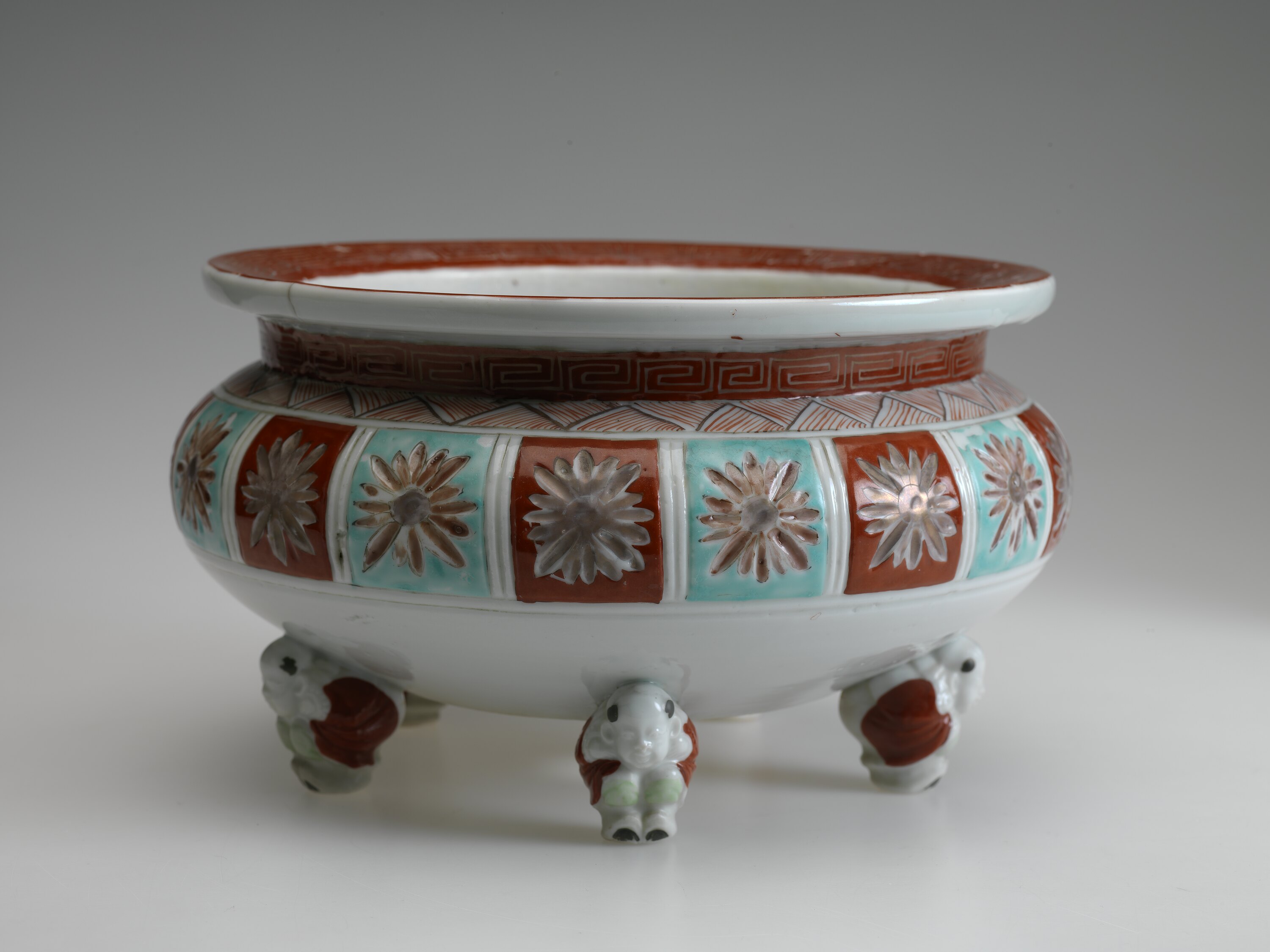 Earthenware jardiniere in red and turquoise glaze supported on five feet in the form of crouching men, manufactured in Japan during the early Meiji Period (1868-1880).
