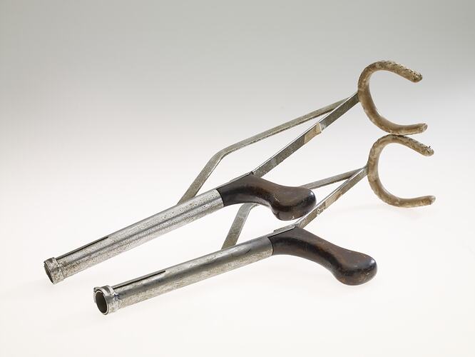 Pair of extendible metal crutches with wooden handled and leather covered arm hooks. Made in France, about 1920. Used at Fairfield Infectious Diseases Hospital, Victoria, Australia, to enable mobility of children with polio.