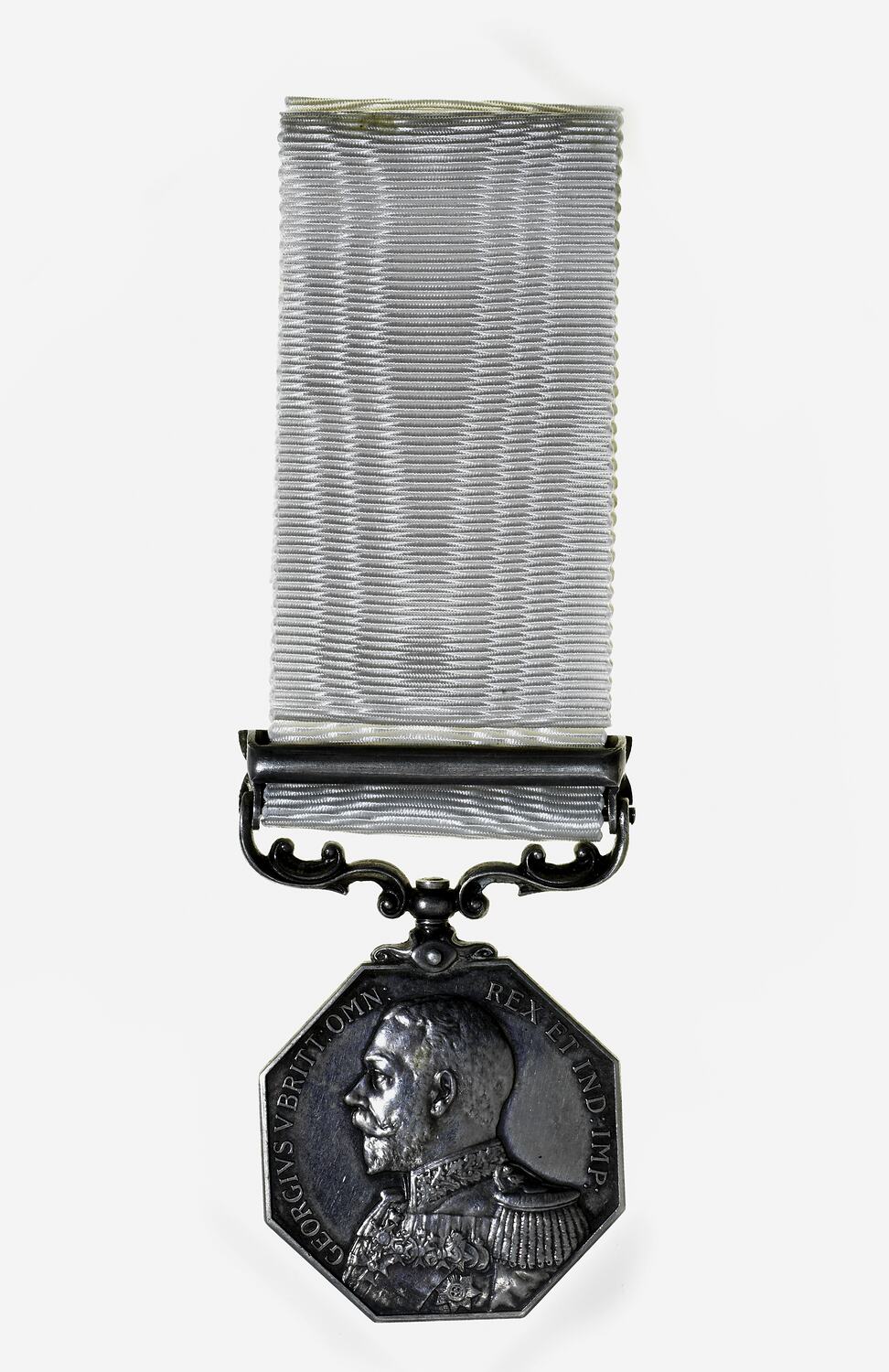 A hexagonal silver medal (32 mm.) with mount and bar ANTARCTIC 1912 - 14. The obverse features a bust of King George V in Admiral's uniform facing left; around, GEORGIVS V BRITT: OMN: REX ET IND: IMP:.The reverse depicts the Royal Research Ship 'Discovery' in the ice with a sledging party of six wearing skis and carrying long poles in the foreground, the sledge has a rectangular sail. The edge is impressed J.H. CLOSE "AURORA".
