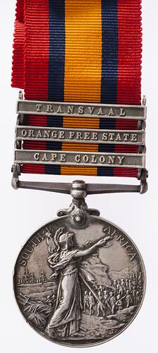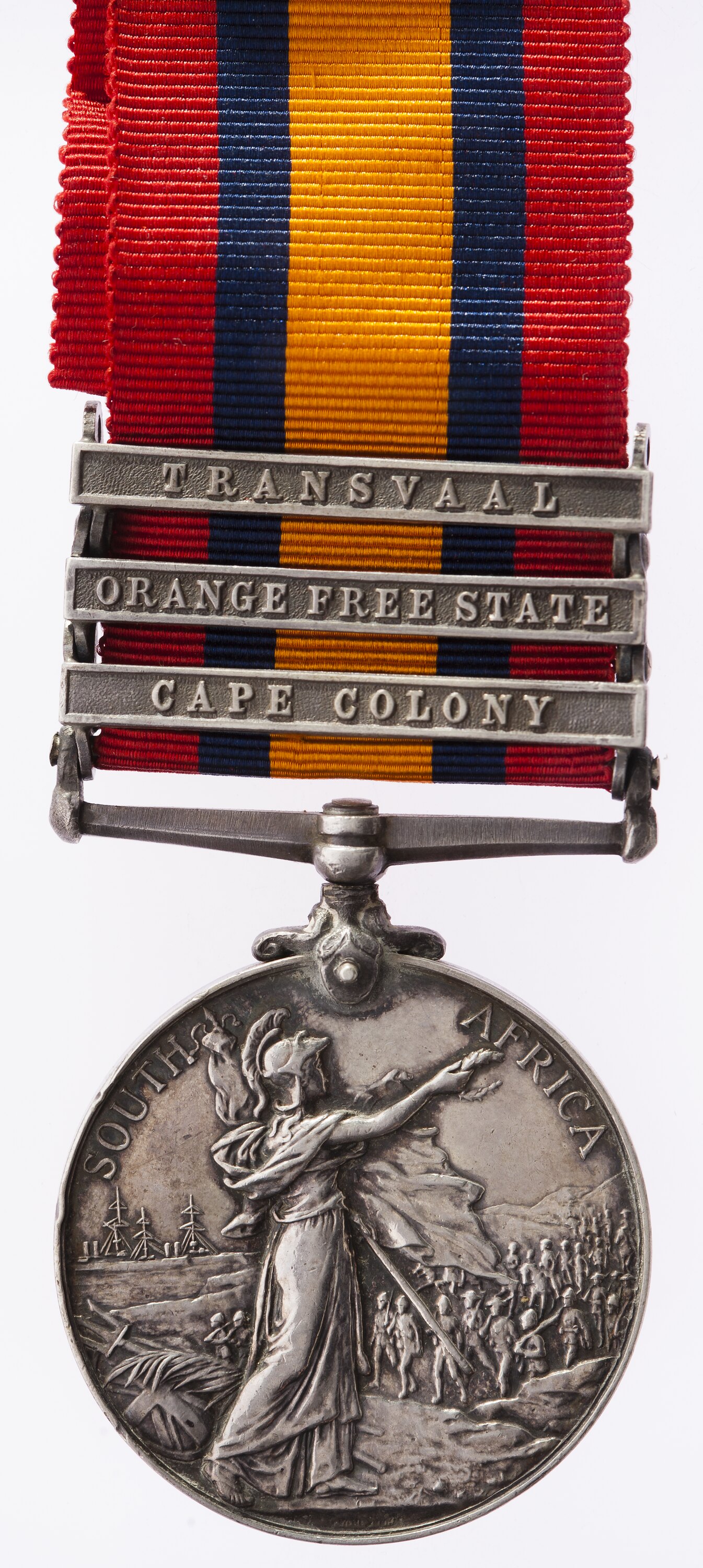A silver medal (36mm diameter) with ribbon and three bars: CAPE COLONY, ORANGE FREE STATE and CAPE COLONY. The obverse features a veiled and crowned half-length bust of Queen Victoria facing left; around, VICTORIA REGINA ET IMPERATRIX, the artist's name, G.W. de Saulles, is incuse on the base of the bust. The reverse depicts Britannia advancing facing right towards a column of marching soldiers, her trident, shield and a palm branch are on the ground behind her; in her left arm she holds a flag and with her right arm extends an laurel wreath towards the column, the fleet is at anchor in the background; around above, SOUTH AFRICA. The edge is impressed: 120 S.S. MAJOR J.M. CLOSE KITCHENER'S F.S.