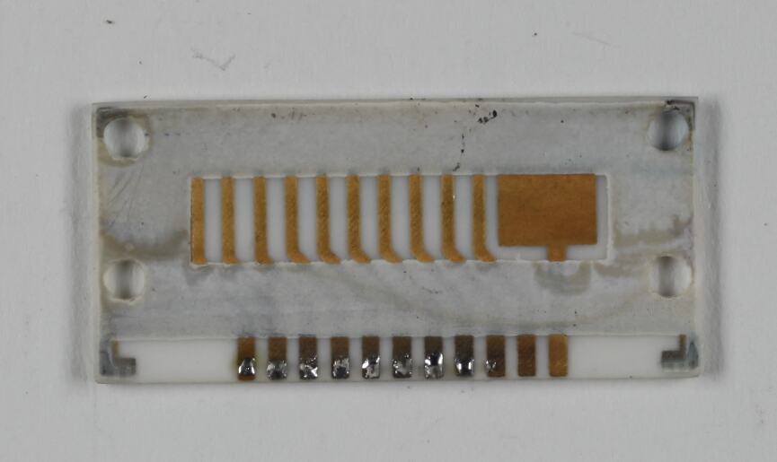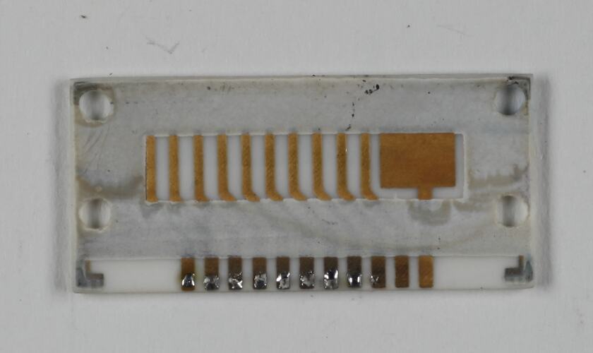 Ceramic substrate with gold printed circuits, used in the development of the prototype receiver-stimulator for the Bionic Ear research at the University of Melbourne.