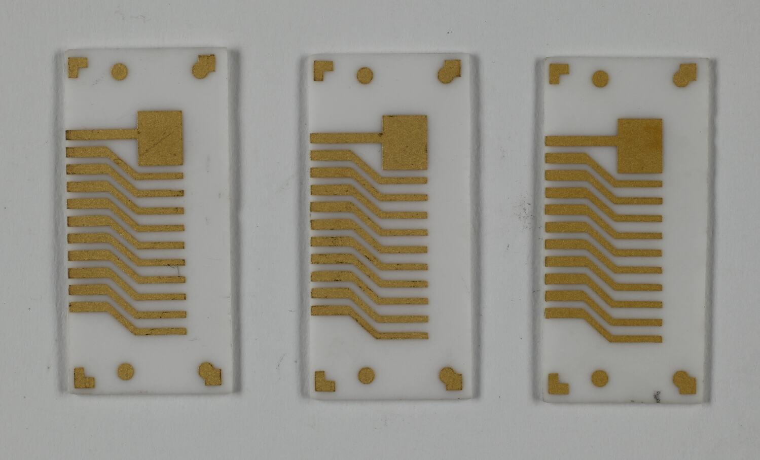 Three ceramic substrates with gold printed circuits, used in the development of the prototype receiver-stimulator for the Bionic Ear research at the University of Melbourne, led by Graeme Clark, 1970s-1980s.