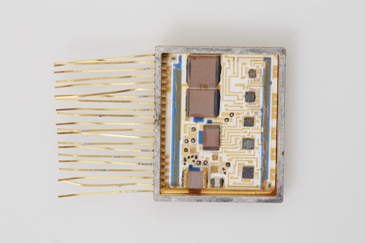 Two rectuangular gold metal boxes with circuitry showing on one side and fine wires protruding from one end.