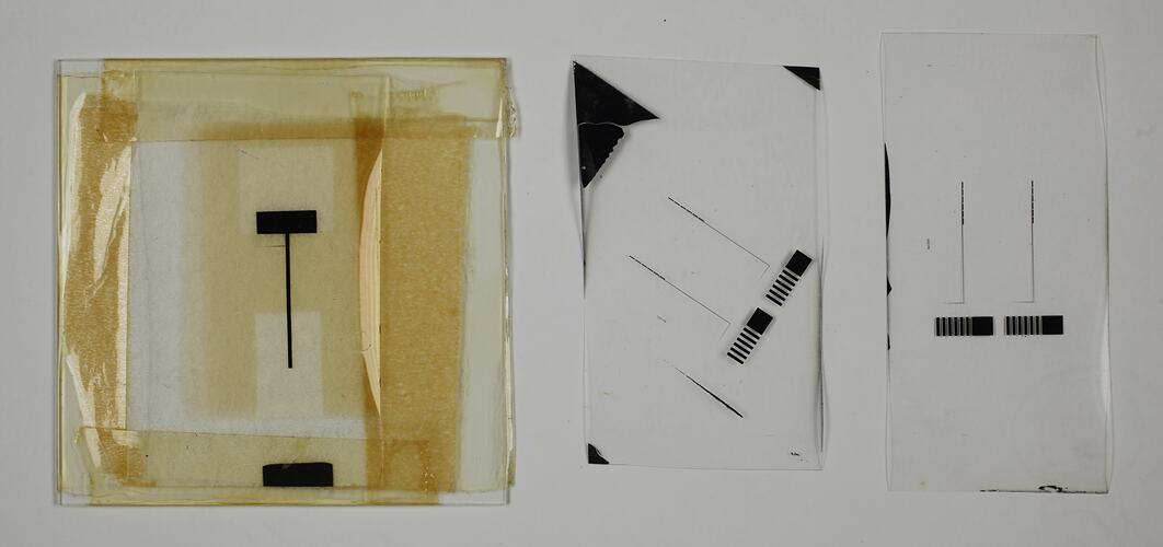 Bionic ear archives project ASAP/Scienceworks 21/45. Four thin circuits, three on acetate(?) film, one packaged against glass slide.