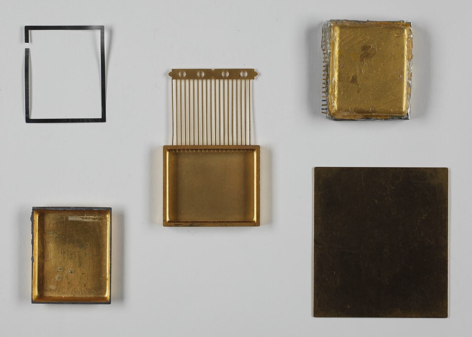Gold metal pieces for assembling the gold box receiver-stimulator for the experimental bionic ear, circa 1978.