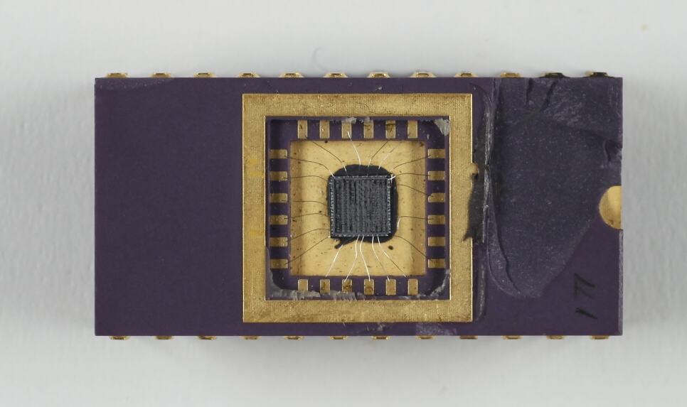 Dark purple plastic rectangle with gold metal circuitry and 24 gold pins underneath. Top of circuit is slightly chipped.