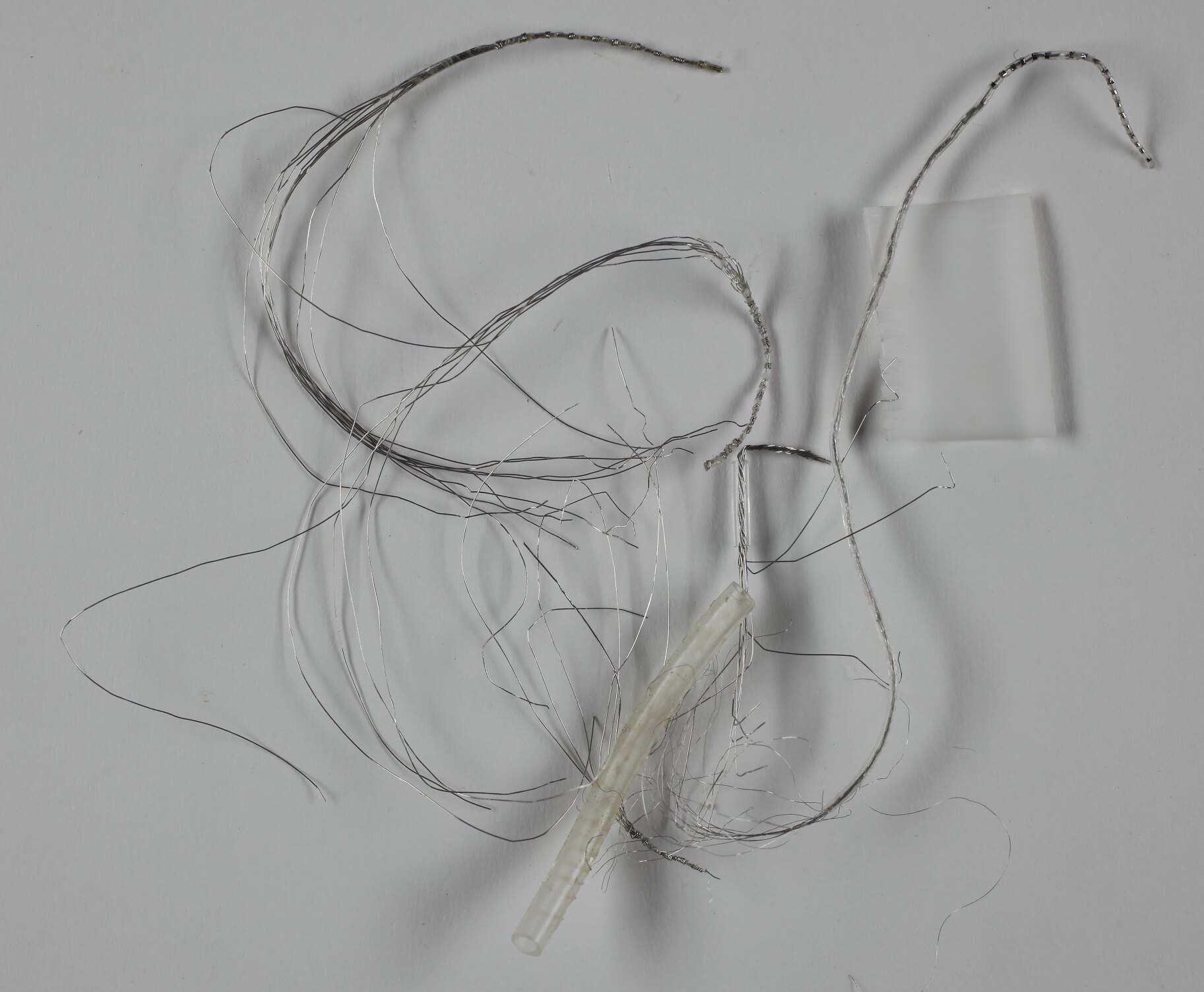 Very thin silver wires twisted and bound with clear plastic tubing.