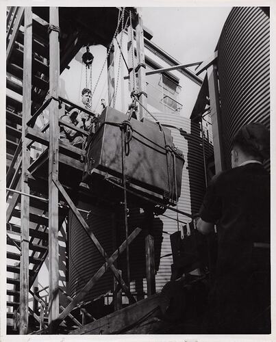 The photograph is angled upwards, with the main focus on two men using a pulley system to hoist a piece of equipment up the outside of a factory building. The two men are positioned on an outside wooden stair structure situated next to a building. Two water tanks are in the back and middle ground of the image positioned next to the stairs. In the foreground is a man holding one of the ropes guiding the pulley. His back is turned to the camera.