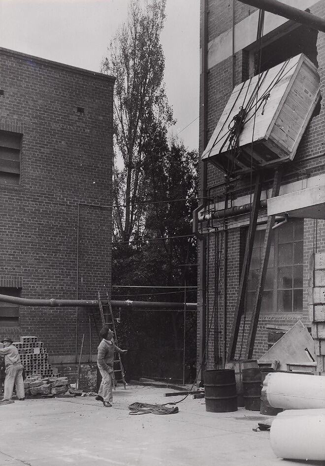 The photograph is taken from ground level and angled upwards. The image consists of two brick buildings and a factory yard with bricks, stone, crates and barrels. Two men are standing at ground level, one of the men wearing overalls, is looking at a large crate being pulled by ropes through a first storey window. Between the buildings there are tall trees.