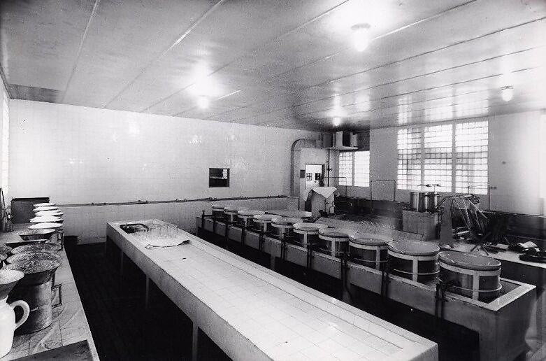 The image consists of an interior view of a room in the factory involving silver nitrate processing. It is a processing area. The walls of the room are tiled, with tiled troughs. In one trough there are ten metal cylinders with tubes and open bowls with liquids in them. Another trough has glass jars upturned. To the left of the image is a tiled bench with containers, some have a white substance in it. To the right and along a wall with windows, there is a bench and trough with equipment including rubber gloves, tubes and glass jars.
