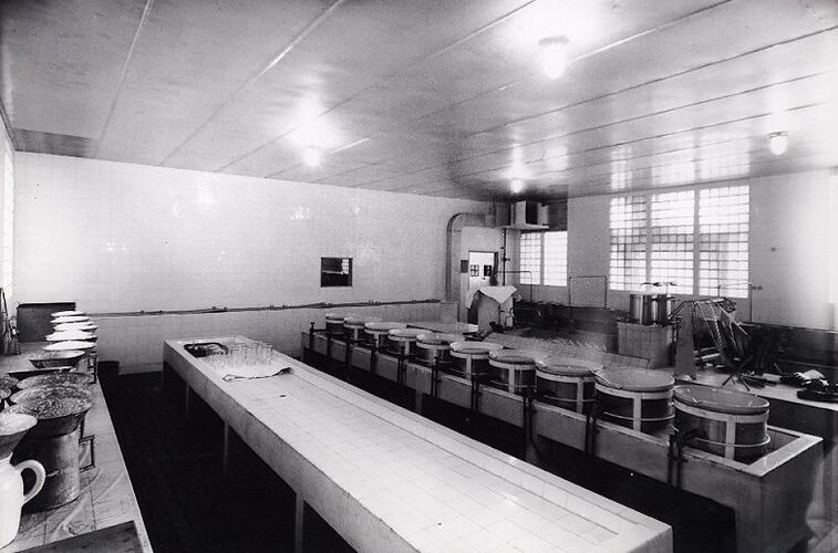Black and white, silver gelatin photograph of a silver nitrate processing room at the Kodak Australasia factory in Abbotsford, Victoria, 1952.