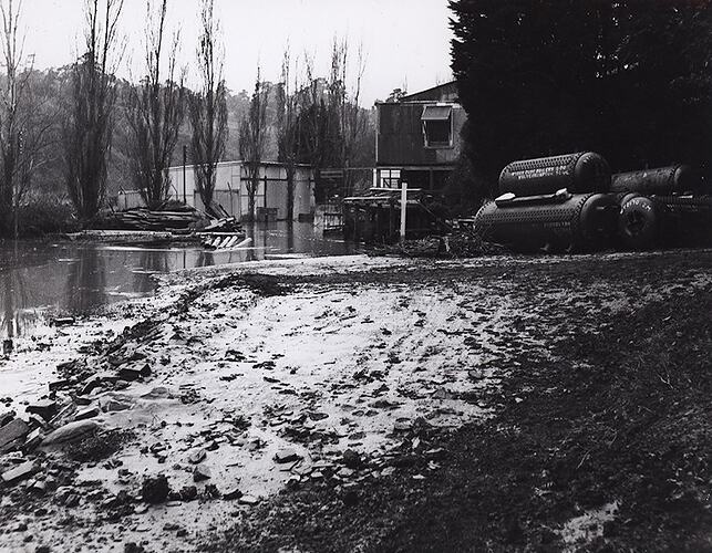 The photograph is dominated by the foreground which shows the bank of the Yarra River on the factory side. In the background, near a group of trees, to the right, are several water tube boilers made in Wolverhampton. To the left of the image, the river is visible, with debris of planks of timber collecting near a line of trees. Two buildings made of aluminium sheeting are in the background and are both still partially submerged by floodwater.
