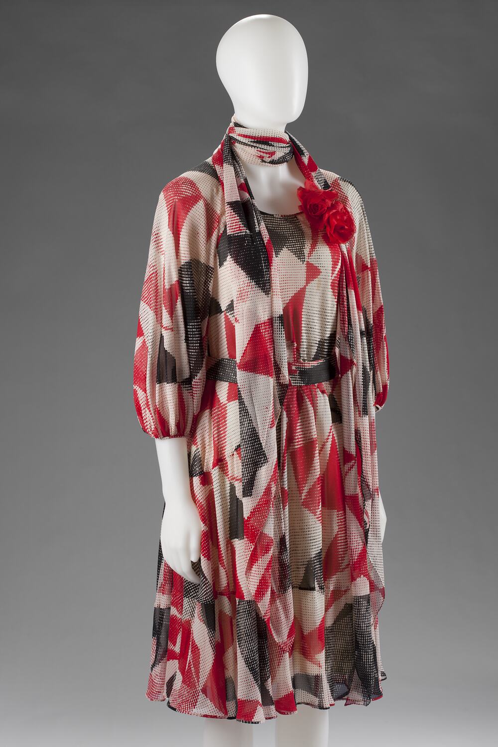 Chiffon dress, white background with red and black dot pattern forming geometric squares. Mid-calf length. Boat neckline. Full skirt with panels of fabric cut on the cross. Centre panel is inserted in a v-shape on the front, with a lower panel forming a frill to the hem. Raglan sleeves, gathered at wrist. Small bow on upper left neckline is used to attach a separate red rosette. Cream silk and synthetic lining. Belt with white sating facing has three press-studs for adjustment. There is a separate scarf in the same fabric.