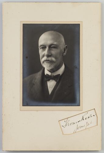 Black and white portrait of a man mounted on buff-coloured card with signature at an angle in bottom right corner. Originally framed.