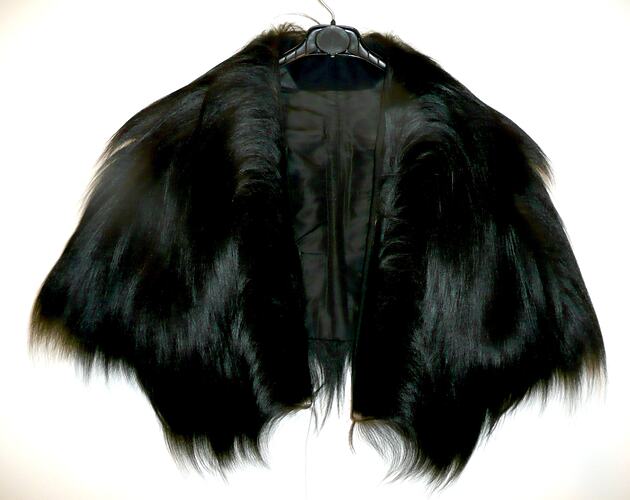 Short cape of long black fur (possibly primate). Fur conceals construction of cape. Shoulder caps inside cape would hold the cape in place - there are no other visible means of fastening. Lined with black silk taffeta with wool facings.