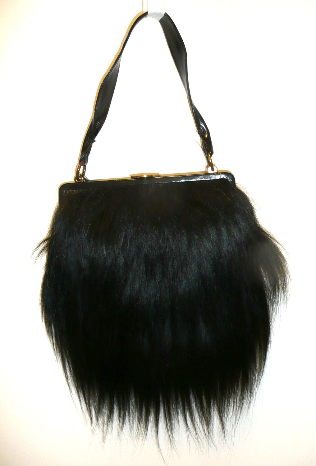 Matching handbag is covered with same black fur, with black leather handle secured with brass rings. Black and gold clasp. Mouth is covered with leather. Interior of bag tan suede leather, with several pockets, two trimmed with black and one with a brass zipper. Pockets are lined with cream satin.