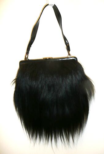 Handbag covered with long black fur, with black leather handle. It was part of an ensemble made by Renee and probably worn by Irredenta Itala Serini, a post-war Italian immigrant who arrived in Australia with her family in 1950. She had trained in Italy as a designer and dressmaker, and worked as a high-end fashion designer in Hobart and Melbourne before setting up her own label in Melbourne in 1959. Madame Serini became a leading prestige women's clothing designer across Australia in the 1960s and 1970s, finally closing in 1981.