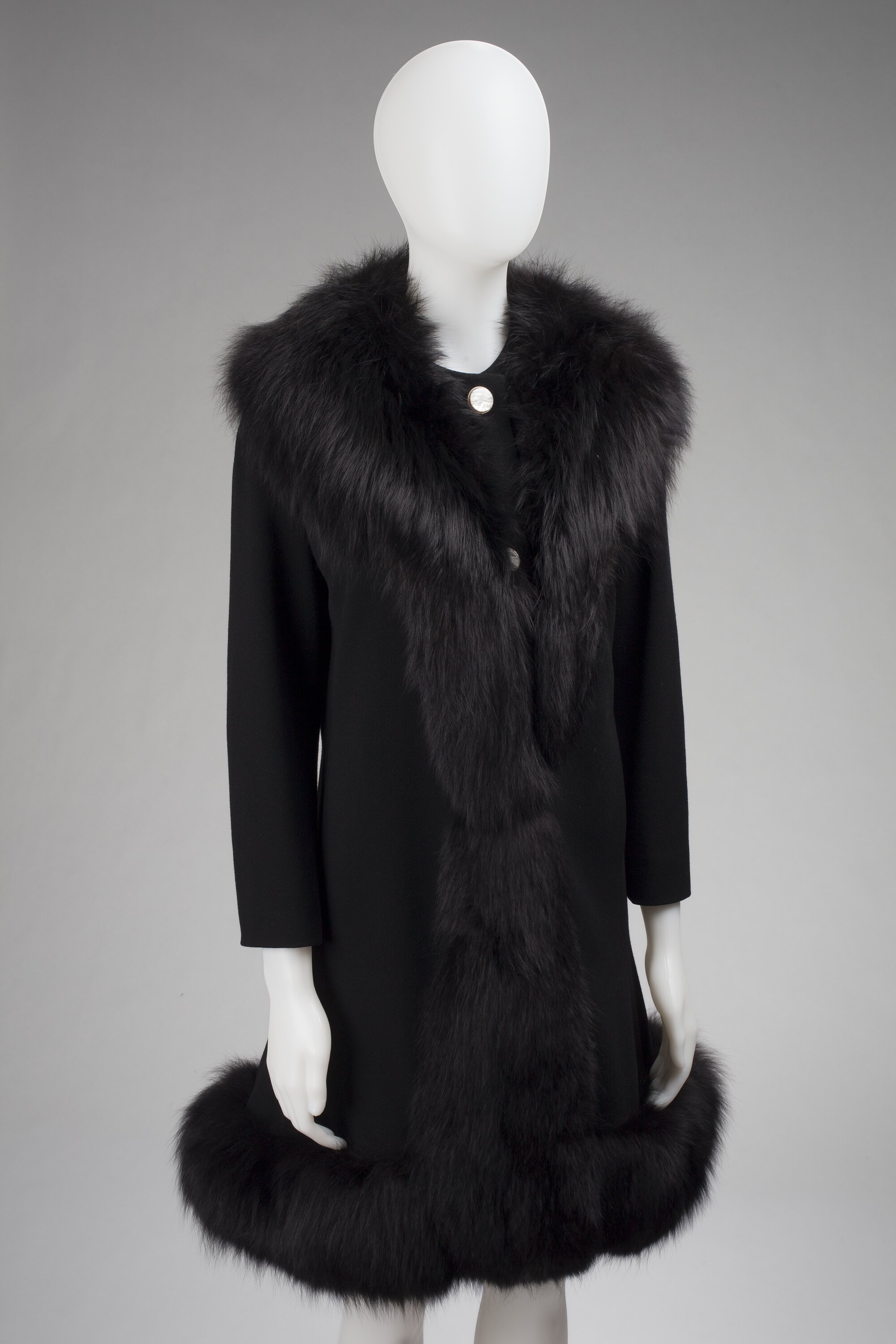 Black wool coat with trim of long black fur (unknown origin) around shoulders, down front and at hem. The fur is positioned to reveal the top button attached to the wool coat. There are four buttons down front, of white pearl shell surrounded by glass diamantes, on a silver metal base. There is a black press stud above bottom button. Slit pocket on each side. Red taffeta lining.