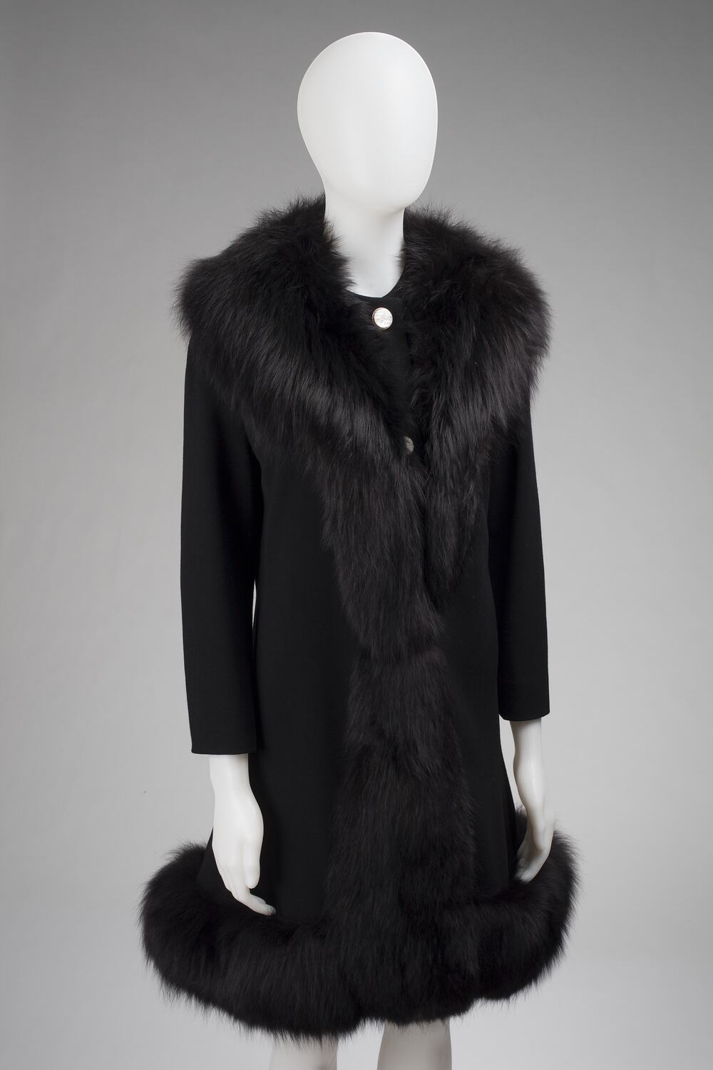 Black wool coat with trim of long black fur, made by the label of Madame Serini (Irredenta Itala Serini). The coat is undated, but is similar in style to a Madame Serini coat depicted in a photograph dated 1968, in the collection of the Italian Historical Society - Co.As.It. (P-06257).