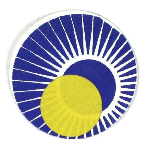 Round sticker, blue and white, featuring central blue circle with white lines radiating out from it. A round yellow sticker has been stuck to the front.