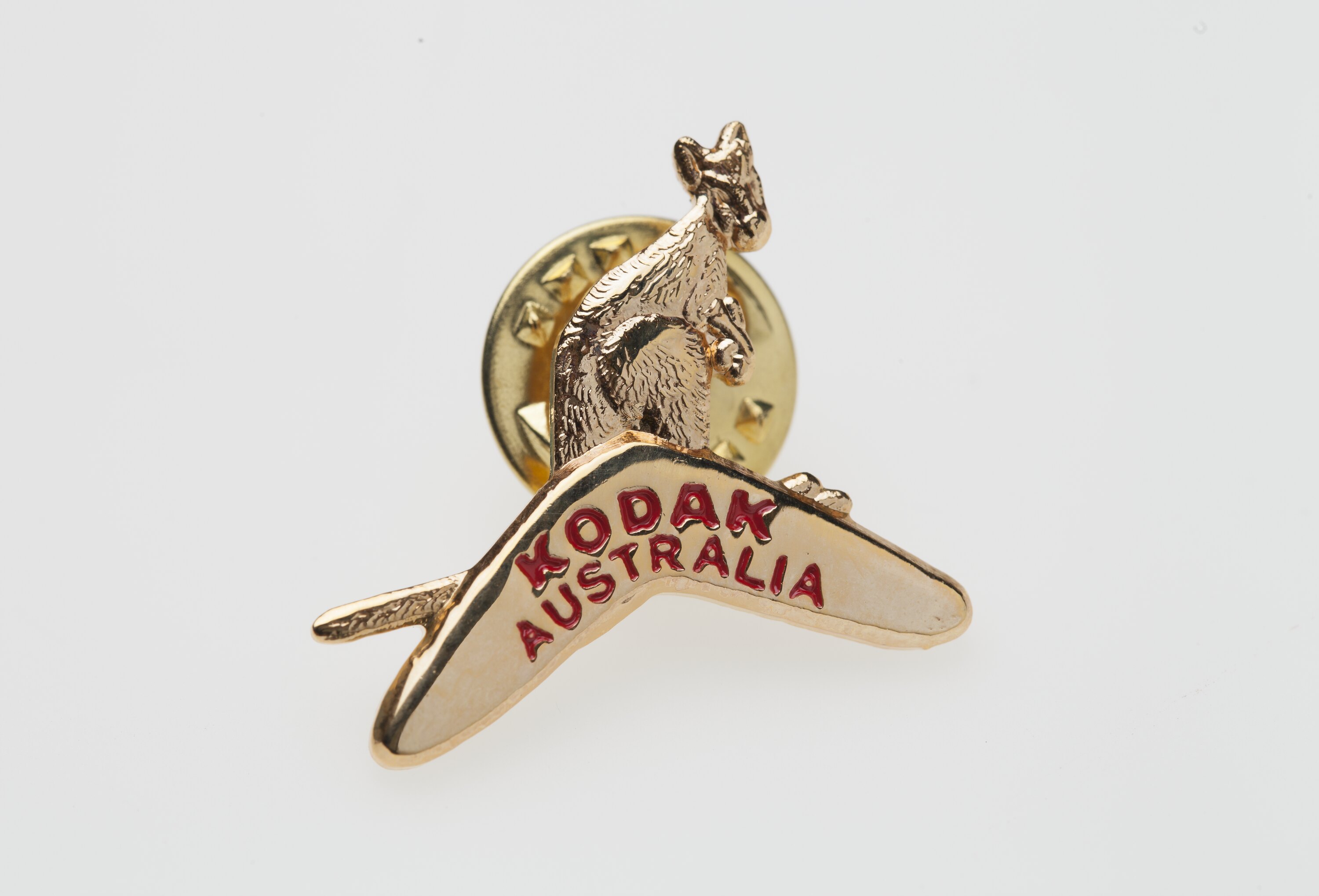 Kodak Australasia Pty Ltd gold-plated lapel pin in the shape of a kangaroo and boomerang, promoting 'Kodak Australia', circa 1980s. It was likely issued to employees and stakeholders as a commemorative and promotional tool.