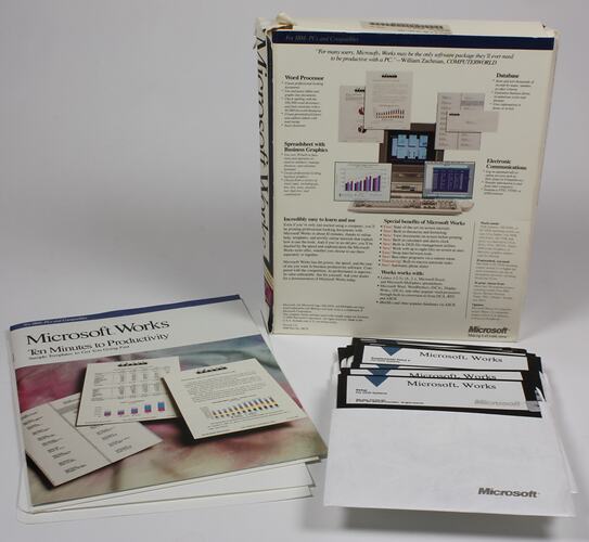 Microsoft Works software for IBM Personal Computers and other compatible computers. Includes programs on Word processing, Databases, Spreadsheets and Electronic communications. Includes twelve 5 1/4 inch disks convering setup, instalation and tuitorials; Ten Minutes to Productivity guide; Microsoft Works Quick Reference guide; Licence Agreement; Microsoft Corporation Technical Support information card; Registration card; and original Invoice Receipt.