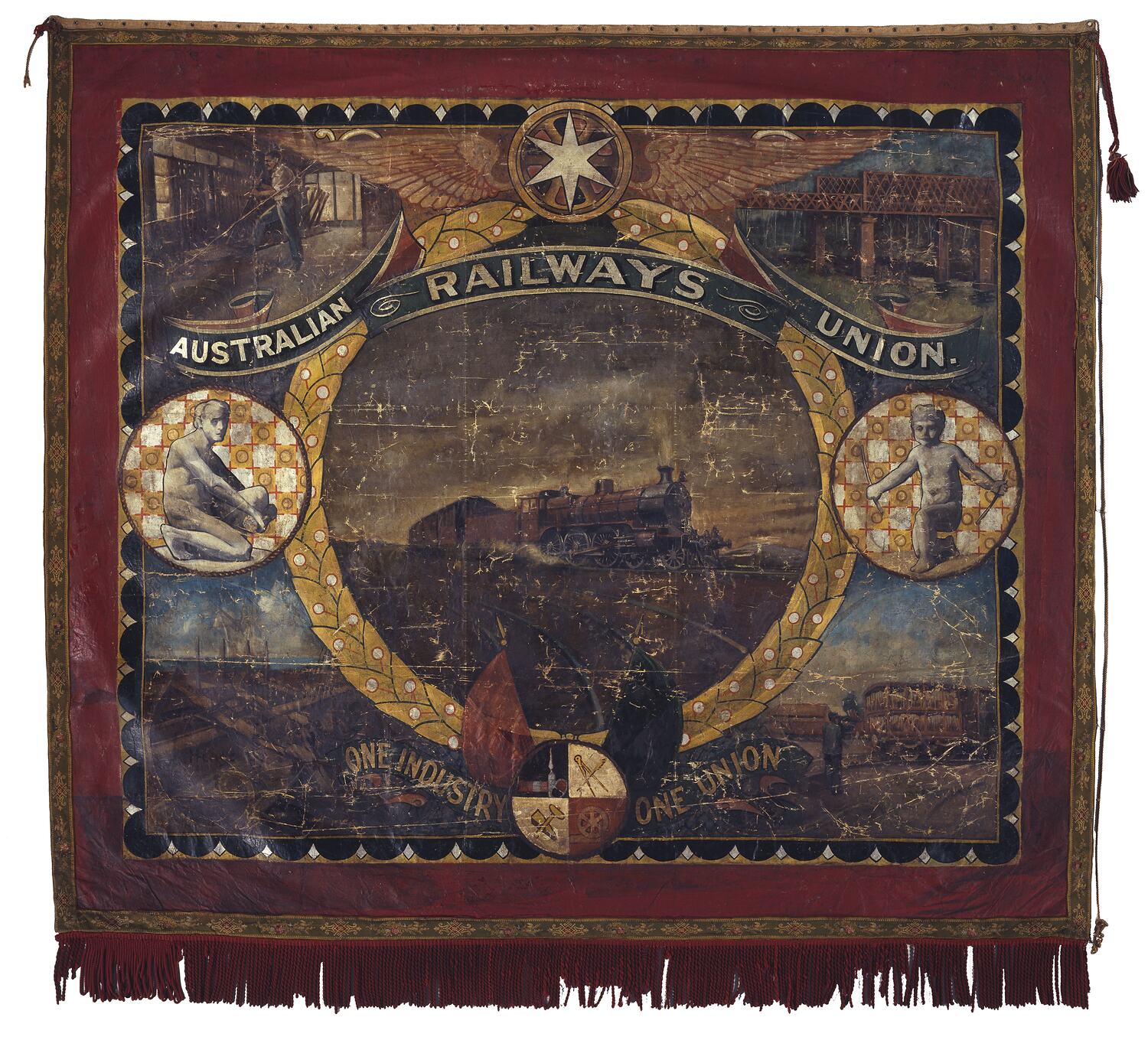 Canvas banner painted about 1911 by John Hennessey of Carlton, Victoria. It was commissioned by the Victorian branch of the Australian Railways Union, and cost £100.