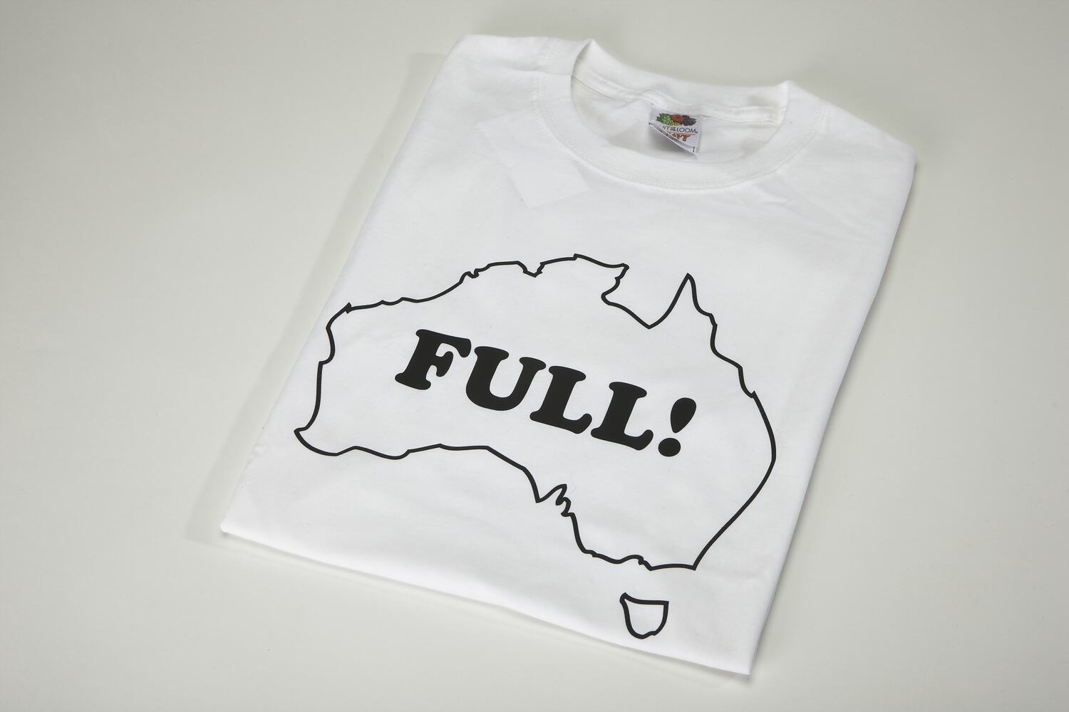 Small white men's t shirt with an outline map of Australia with the word "Full!" in the centre. This t-shirt was sold by the Politically Inc(correct) T-Shirts shop online. This shop is based in the United States of America and has a page exclusively dedicated to 'Australian merchandise' - all of which is related to Australian nationalism. This shop is referred to by the website Australian Nationalist Resource.