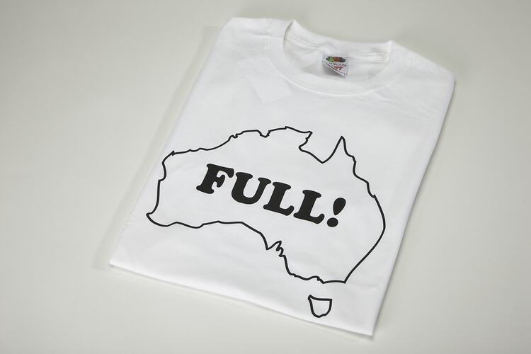 One of a series of t-shirts which are examples of racist and nationalist memorabilia. The slogans on these t-shirts are racist and seek to define Australian identity by excluding 'the other'. Placed in a historical context the t-shirts reflect anxieties about foreign invasions and a xenophobia that has characterised public discourse in Australian colonies since the Victorian gold rushes of the 1850s. The t-shirt with the slogan: "Proud European Australian" is an adaptation to Post World War II migration mostly from Europe and indicates a solidarity with other European nations, especially white. The t-shirt displaying the outline map of Australia with "Full!" in the centre is a continuation of Australian fears of being 'swamped' by foreigners. This image and its variations appear scrawled on white human skin and t-shirts at the Cronulla riots in December 2005 and on Australia Day celebrations and disturbances, including that on Manly beach on 26 January 2009. The use of the white map of Australia iconography, formerly a common feature of medals, badges and stamps, is an echo of the 'White Australia' policy of the early 20th century.