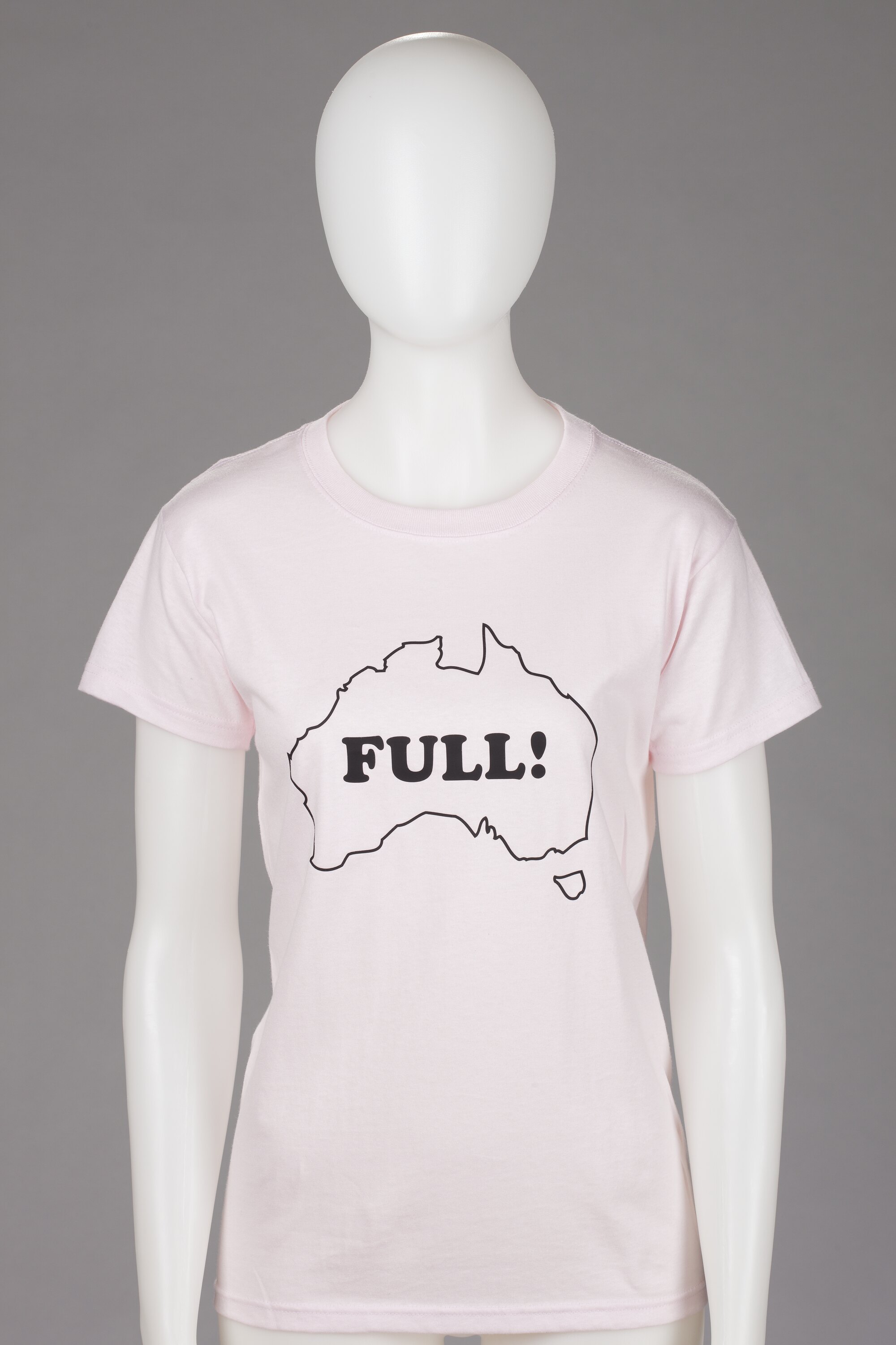 Size small light pink women's t shirt with an outline map of Australia with the word "Full!" in the centre.