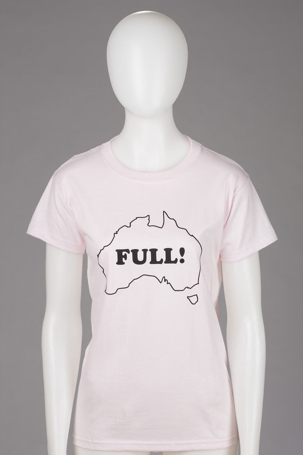 Size small light pink women's t shirt with an outline map of Australia with the word "Full!" in the centre. This t-shirt was sold by the Politically Inc(correct) T-Shirts shop online. This shop is based in the United States of America and has a page exclusively dedicated to 'Australian merchandise' - all of which is related to Australian nationalism. This shop is referred to by the website Australian Nationalist Resource.