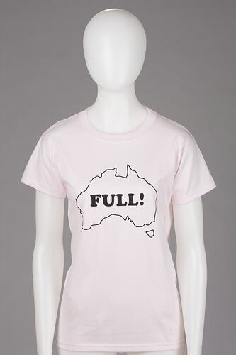 One of a series of t-shirts which are examples of racist and nationalist memorabilia. The slogans on these t-shirts are racist and seek to define Australian identity by excluding 'the other'. Placed in a historical context the t-shirts reflect anxieties about foreign invasions and a xenophobia that has characterised public discourse in Australian colonies since the Victorian gold rushes of the 1850s. The t-shirt with the slogan: "Proud European Australian" is an adaptation to Post World War II migration mostly from Europe and indicates a solidarity with other European nations, especially white. The t-shirt displaying the outline map of Australia with "Full!" in the centre is a continuation of Australian fears of being 'swamped' by foreigners. This image and its variations appear scrawled on white human skin and t-shirts at the Cronulla riots in December 2005 and on Australia Day celebrations and disturbances, including that on Manly beach on 26 January 2009. The use of the white map of Australia iconography, formerly a common feature of medals, badges and stamps, is an echo of the 'White Australia' policy of the early 20th century.