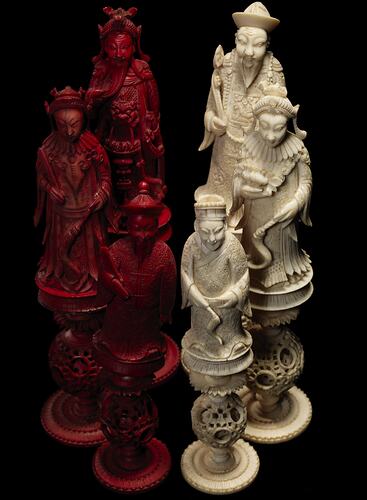 Each chess piece is constructed from a carved figure on a decorative stand which can be unscrewed and separated into components. Each decorative stand consists of a circular base, a central ornate hollow orb with a smaller carved ball inside, and an upper rosette joiner.
