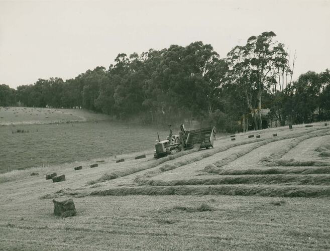 In black type on back, 'No. 346 / Neatly raked windrows of clover and rye-grass being / baled by a Sunshine Pickup Baler on hillside at Warrenbayne, Vic.' In blue stamp pad ink, 'H.V.McKAY MASSSEY HARRIS PTY. LTD. / SUNSHINE, VICTORIA, AUSTRALIA / Photo Reg. No346 DEC 1949'