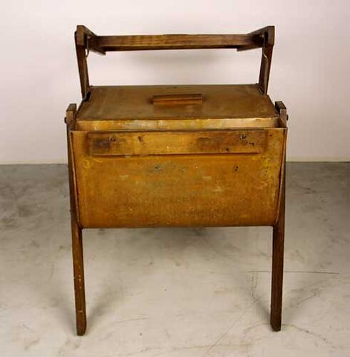 Manually-operated rocker-style wooden washing machine. Main body has top-opening. Mounted on legs.