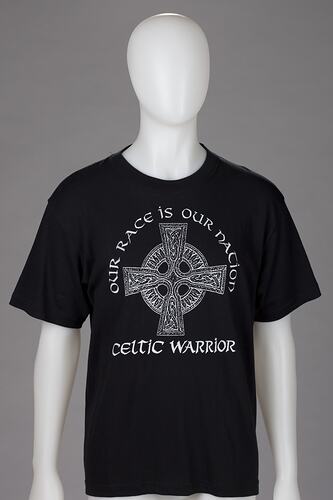This is one of a number of nationalist t-shirts recommended on Australia First Party (NSW) website. The significance of this t-shirt lies in its use of white supremacist symbolism and in its association with the right-wing political party Australia First Party (NSW).